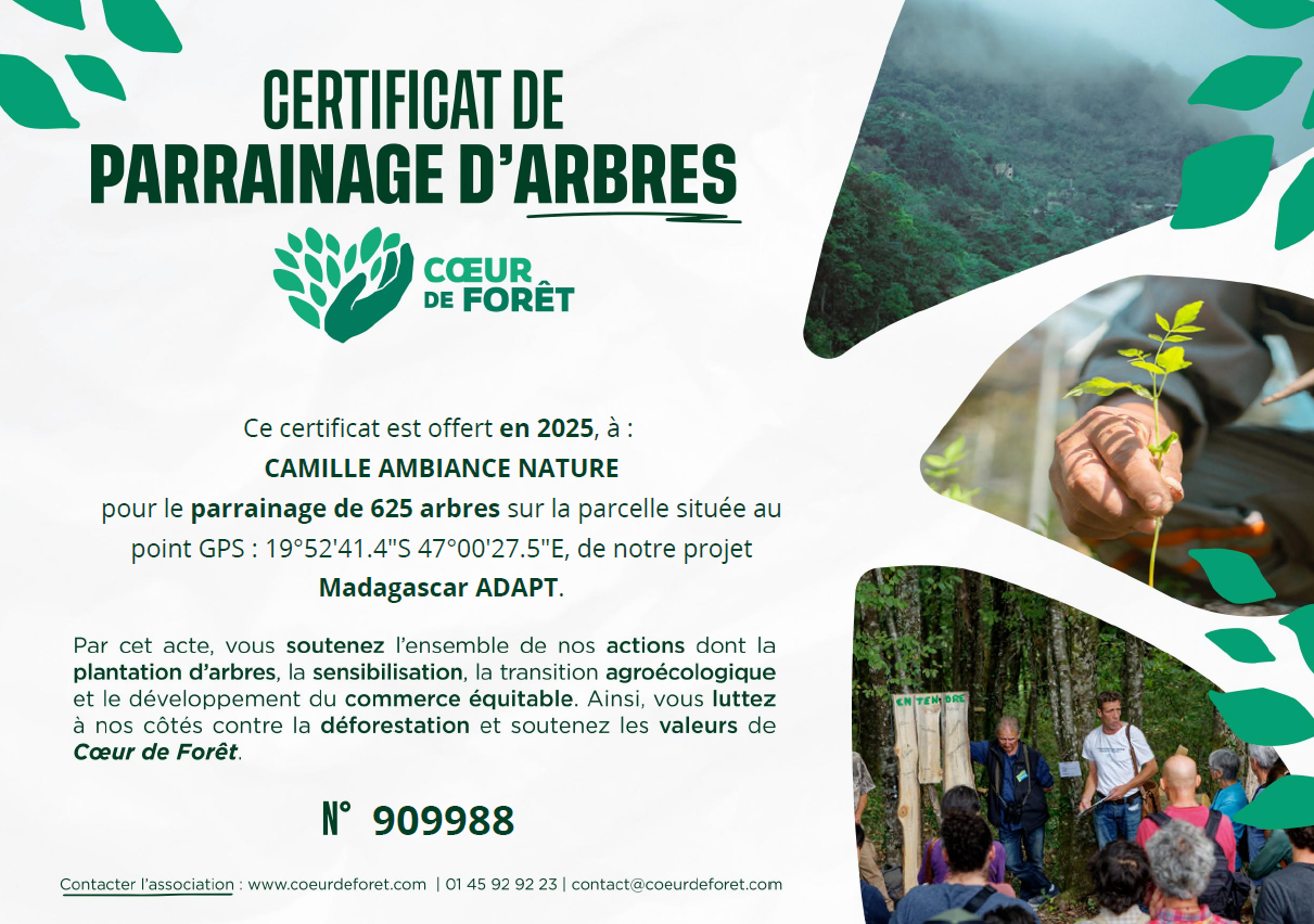 En 2025, Camille Ambiance Nature a choisi d’aller plus loin dans son engagement environnemental en soutenant activement le projet Madagascar ADAPT, un programme de reforestation et de préservation des écosystèmes locaux.