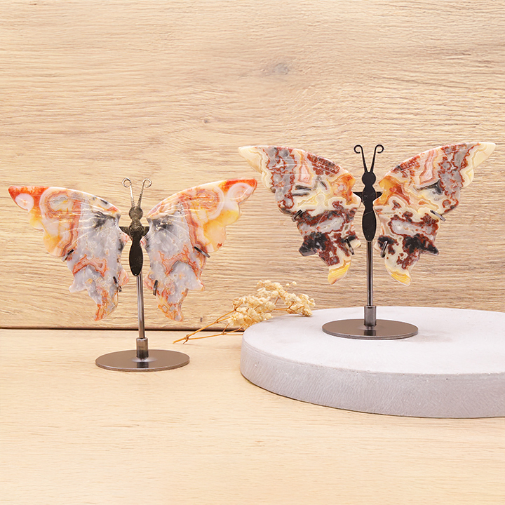 Bracelets, figurines, and pendants in crazy lace agate. Pebbles and donut stones in agate.