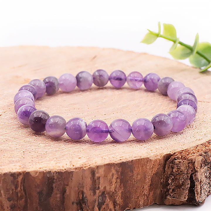 Bracelets and pendants in engraved amethyst. Rolled stones of engraved amethyst.