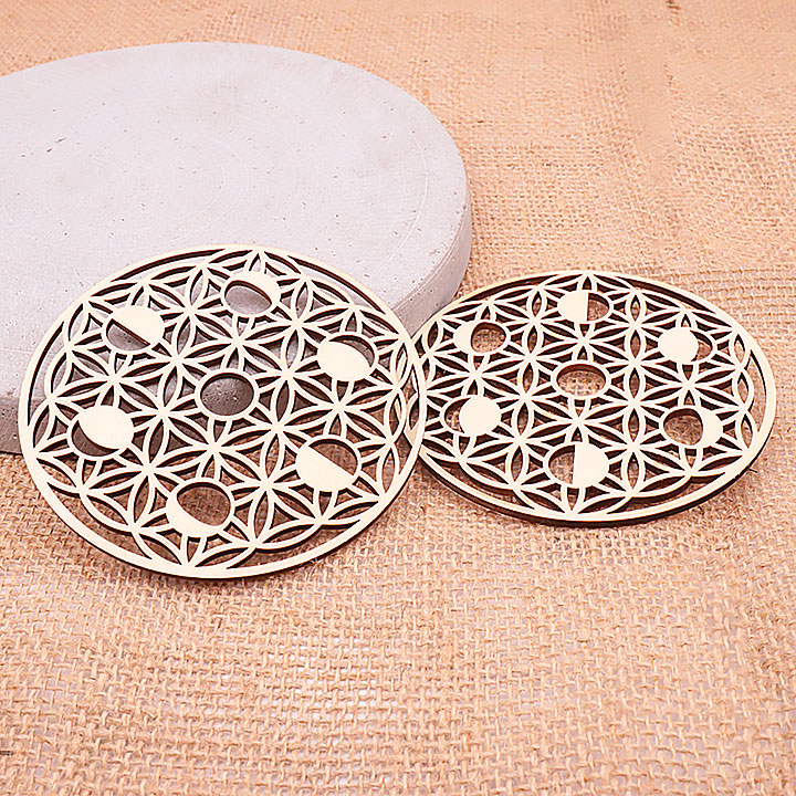 Wood plaque model 03 flower of life / hollow lunar phase cut 100mm (set of 3 pieces)