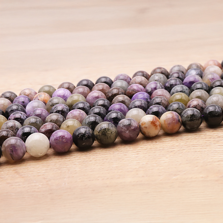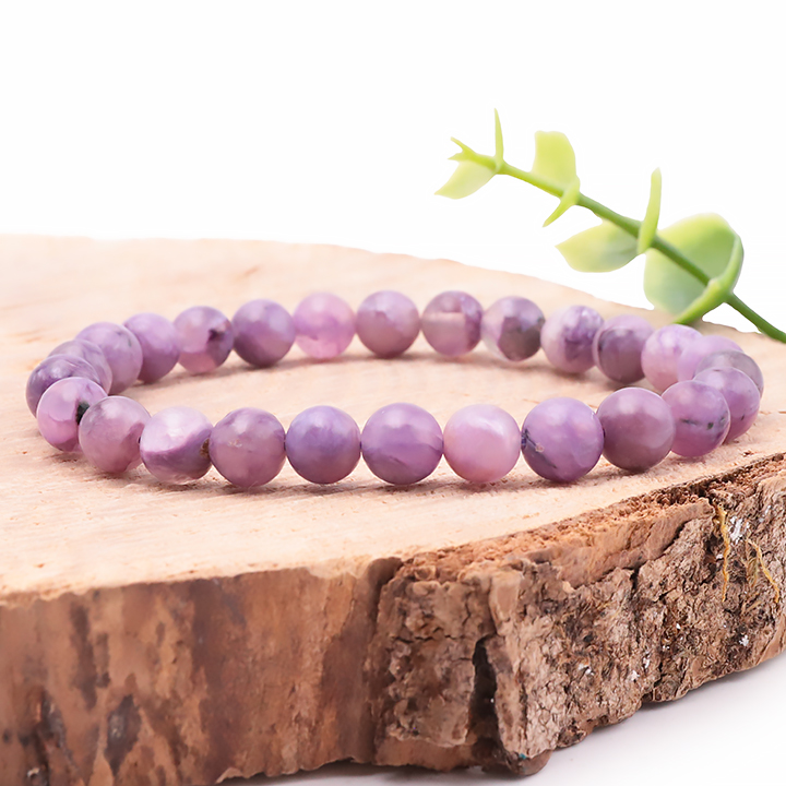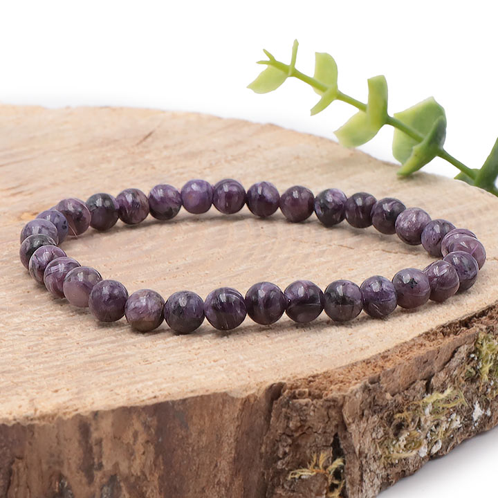 Rings, bracelets, and pendants in charoite. Tumbled charoite stones.