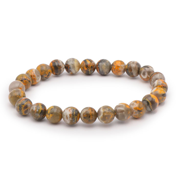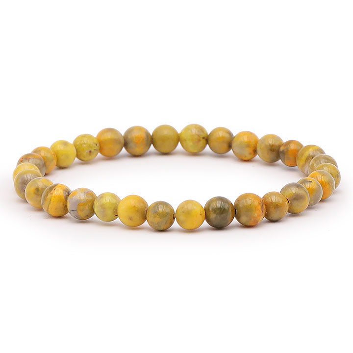 Bracelets with round beads or faceted stones and pendants in bumblebee jasper.