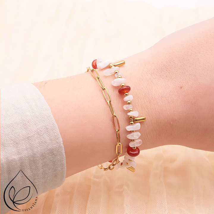 Bracelets and pendants in beige moonstone. Faceted moonstone beads.