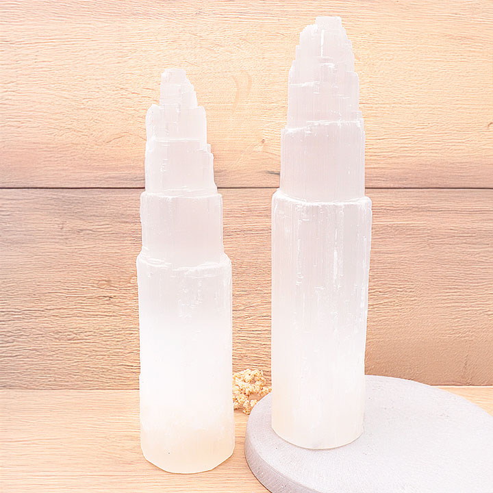 Selenite bracelets and pendants. Pebbles, rolled stones, pierced stones and points polished selenite.